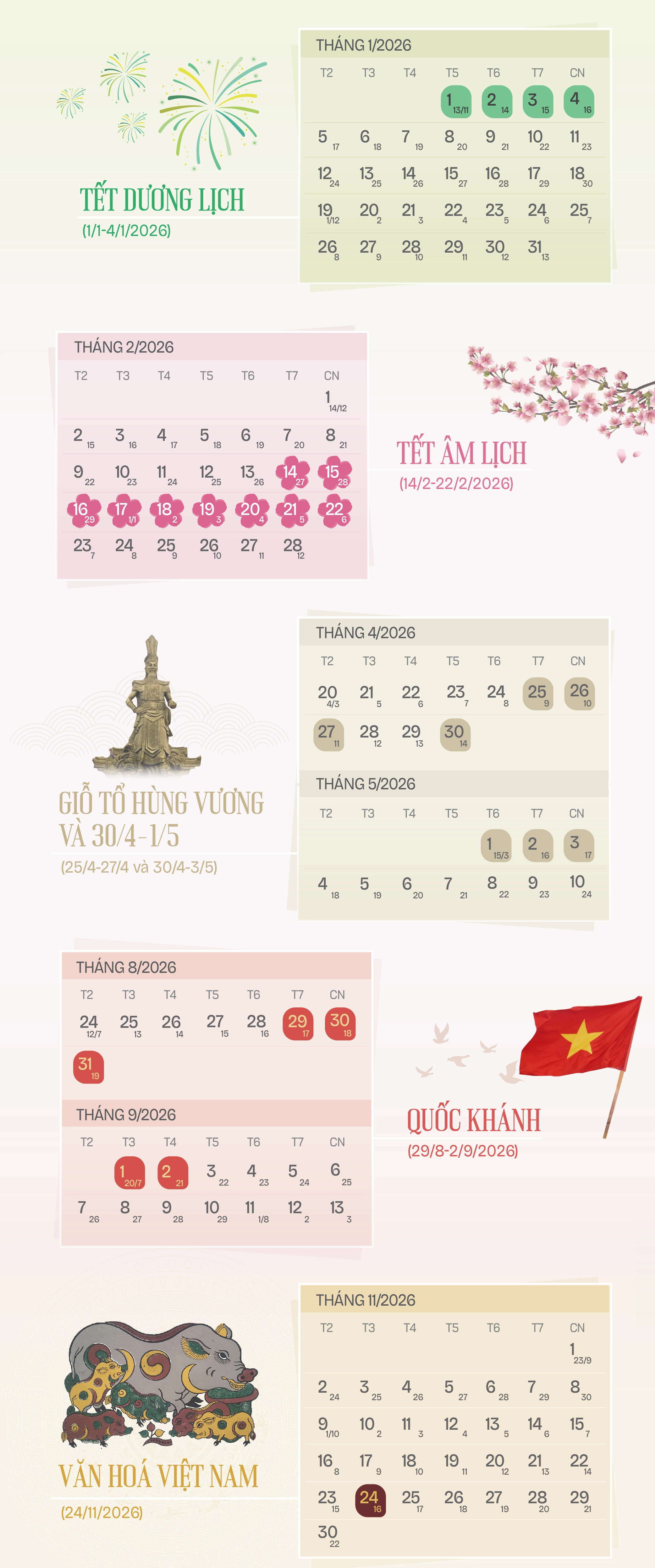 Bộ Nội vụ ban hành thông báo về lịch nghỉ tết Âm lịch, nghỉ lễ Quốc khánh năm 2026 để các cơ quan hành chính, sự nghiệp, tổ chức chính trị, tổ chức chính trị - xã hội, doanh nghiệp và những người sử dụng lao động khác thực hiện.